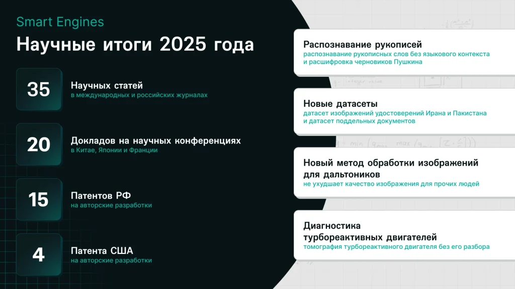 Российская ИИ-компания Smart Engines, технологический лидер на рынке распознавания документов, подвела научные итоги 2025 года. В минувшем году исследователи опубликовали 35 научных статей в международных и российских журналах, а также представили 20 докладов на престижных научных конференциях в Китае, Японии и Франции. На свои изобретения исследователи получили 15 новых патентов в РФ и 4 – в США.