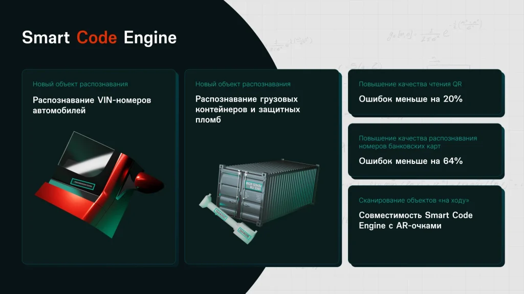Теперь решение может также распознавать VIN-номера автомобилей, номера грузовых контейнеров по международным стандартам и данные защитных пломб. Новые возможности продукта делают его ценным инструментом для автоматизации промышленных процессов — от логистики и контроля грузов в портах, терминалах и складах до ускорения операций в сервисных центрах и других участках цепочек поставок. Функциональность Smart Code Engine может разворачиваться не только на смартфонах, но также интегрироваться с AR-очками и другими устройствами дополненной реальности, что позволяет инспекторам и операторам получать нужную информацию буквально «по одному взгляду» на объект.