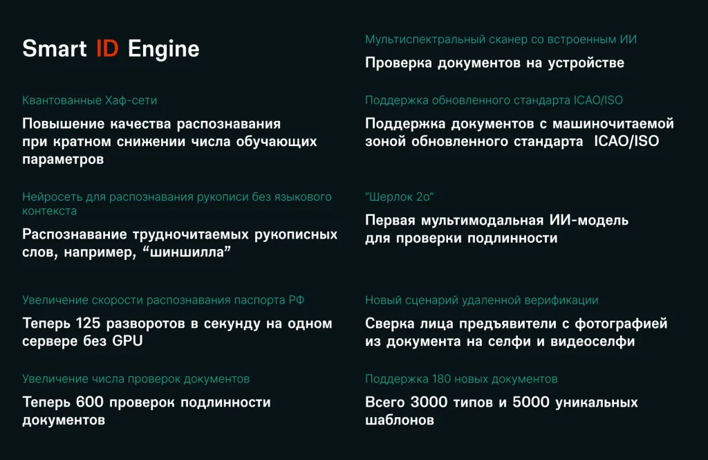 Обновление в 2025 году также получил флагманский продукт Smart ID Engine для распознавания и проверки паспортов и других удостоверяющих личность документов. Качество распознавания в Smart ID Engine 2.0 выросло благодаря авторской архитектуре квантованных Хафовских нейронных сетей. Эта технология позволяет системе уверенно работать с любыми изображениями — смазанными, частично перекрытыми или снятыми в сложных условиях, при этом число обучаемых параметров уменьшено более чем в 100 раз. Благодаря авторской модели “Да Винчи” система считывает данные даже при наличии геометрических искажений, в условиях зеркального отображения документа в кадре и при низкой освещенности.