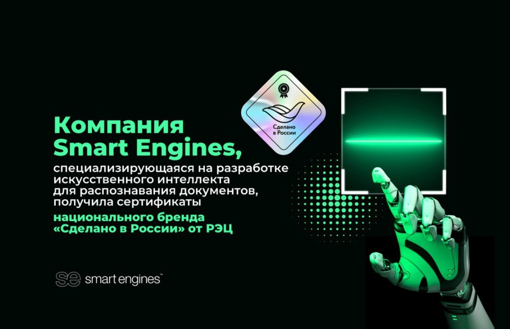 Компания Smart Engines (ООО «Смарт Энджинс Сервис»), специализирующаяся на разработке искусственного интеллекта для распознавания документов, получила сертификаты национального бренда «Сделано в России» от Российского экспортного центра (РЭЦ. Группа ВЭБ) для своих ключевых программных продуктов — Smart ID Engine и Smart Code Engine.